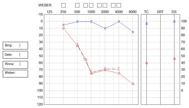Disse 2 hørekurver viser et eksempel på udpræget ensidig hørenedsættelse. Venstre øre (blå kurve) har en alderssvarende hørelse, mens hørelsen i højre side (rød kurve) er meget reduceret især på de højere frekvenser.